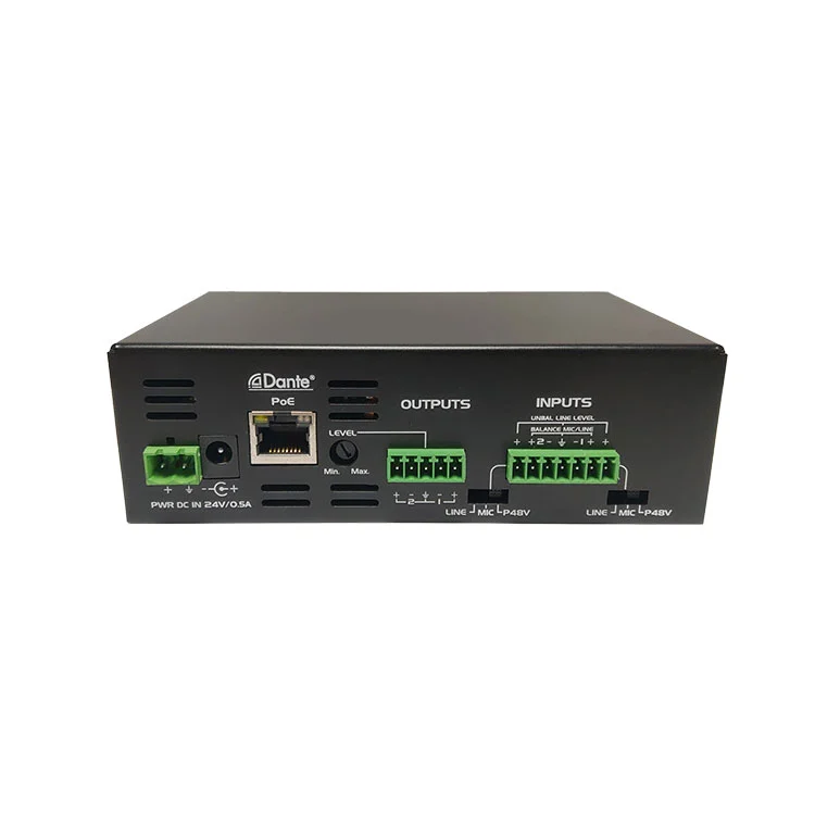 • Převod zvukového zvuku s dvojitou kanálem-převádí standardní signály Analogových zvukových signálů MIC nebo Line na síťové proudy Dante.