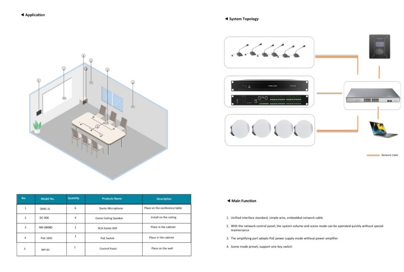 Síťový zvuk Dantelze přenášet na Ethernetu (100 m nebo 1000 m) a lze jej nastavit pro komplexní směrování. Ve srovnání s tradičními technologiemi přenosu zvuku zdědí všechny výhody Cobranet a EtherSound, jako jsou nekomprimované digitální zvukové signály, což zajišťuje dobrou kvalitu zvuku. Dante Audio má své vlastní jedinečné výhody a jaké jsou výhody inteligentního konferenčního systému FHBaudio Dante? Viz následující informace: